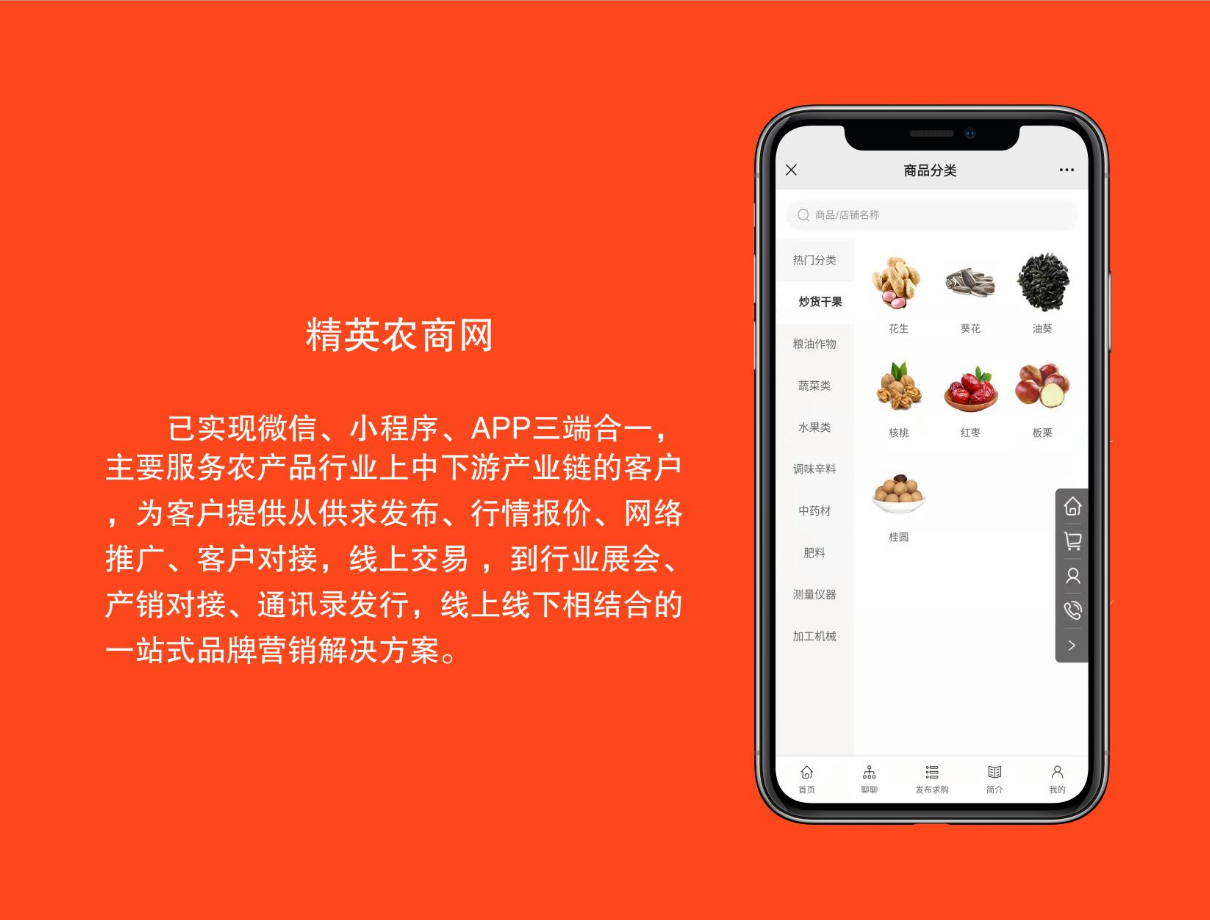 供求发布、行情报价、网络推广、客户对接、线上交易等,助力农产品行业电子商务的发展。